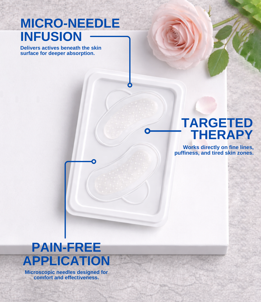 For best results, leave the patches on for at least 2–4 hours or overnight. This gives the micro-needles enough time to fully dissolve and absorb into the skin.